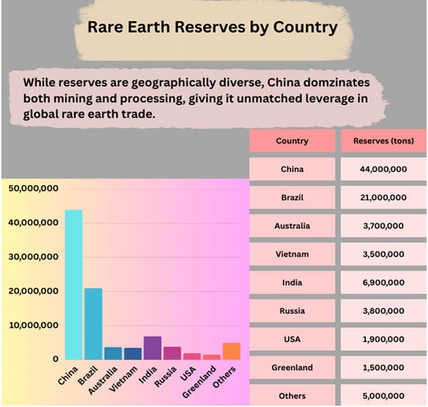 The image painted by the reserves is equally telling. China has far more rare earth deposits than any other country, with an estimated 44 million tons. Brazil also has enormous reserves (21 million tons), while the United States, Russia, Vietnam, and India all have large resources.