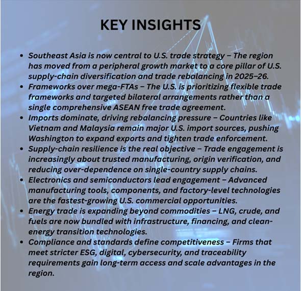 At the same time, the number of people in Southeast Asia who buy things keeps growing. As per Asia Import Data by Import Globals, this creates a need for U.S. exports including planes, energy products, farm goods, medical technologies, and high-value services. But the broader story isn't only about the numbers; it's also about how the U.S. is becoming involved. Washington is moving away from the idea of a single, all-encompassing "mega-FTA" and toward more flexible frameworks, targeted bilateral agreements, and cooperation in specific sectors. These can move faster and focus on today's problems, such as standards, trusted supply chains, digital rules, critical minerals, and financing for clean energy.