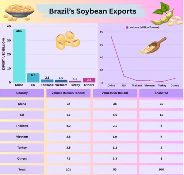 Ans. China is the largest buyer, accounting for about 70% of Brazil’s total soybean exports.