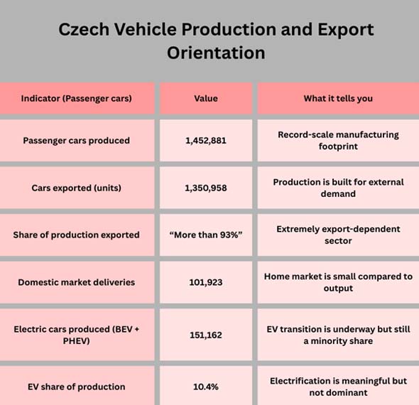 The Czech Republic is one of Europe’s most export-oriented automotive powerhouses. It is not just a country that “makes cars”; it is a country that runs inside a regional production system—a tightly coordinated Central European supply chain anchored to German and broader EU demand.