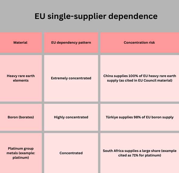Europe gets a lot of the raw materials it requires from other countries, and for some materials, it relies nearly completely on one outside provider. EU institutions and Council documents show cases where one country controls the supply.
