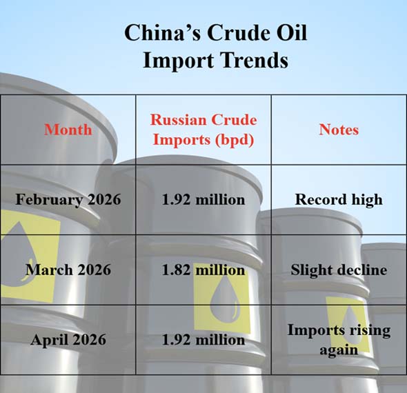 Recent information shows that China has been buying more from Russia because it can't trust the supply from the Middle East as much. In March 2026, China bought about 1.82 million barrels of Russian crude oil every day. This was a little less than the record high of 1.92 million barrels per day that was set in February.