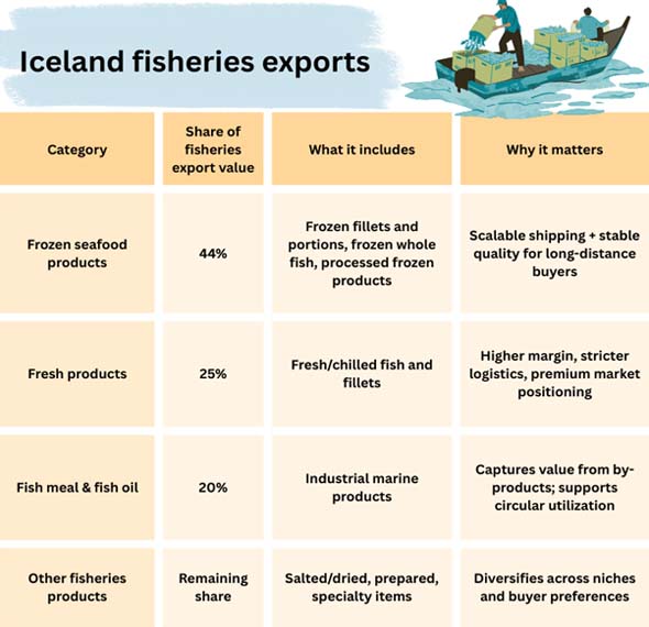 One way to determine how advanced it is is to look at the different types of products instead of just "fish exports."Frozen foods are usually the most valuable, but fresh, chilled, and industrial foods (such fishmeal and fish oil) are also important. This shows that Iceland is focused on getting the most value out of each catch by processing it, using cold-chain logistics, and dividing the market.