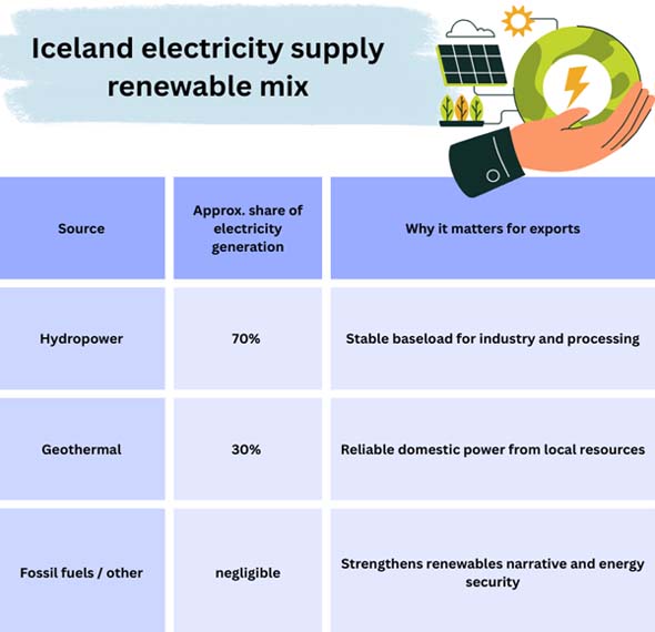 As per Iceland Importer Data by Import Globals, Iceland’s energy system is frequently cited as a global reference point: almost all electricity production comes from hydropower and geothermal, and renewable energy also plays a major role in heating. This matters for exports in three ways: