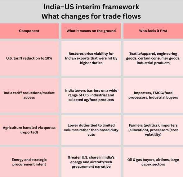 Ans. It lowers tariffs, which makes prices better, but the results rely on how well it is put into action, what products it covers, and how long it lasts politically, especially in agriculture and strategic conditions.