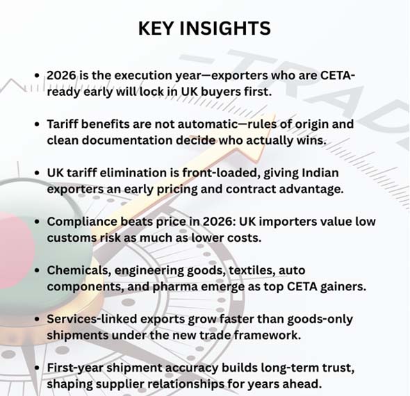 The main point for Indian exporters is that the UK is aggressively front-loading its approach. People say that the UK will soon and broadly remove tariffs on Indian goods. This is important because the UK market rewards speed: the first suppliers to land compliant, favored shipments generally win the first-year shelf space, distributor mindshare, and long-term supply agreements. Exporters who think of CETA as "just a tariff story" are missing out on a bigger chance: more predictable rules, easier customs processes, and clearer paths for trade in services (after-sales, installation, maintenance, design, IT delivery).