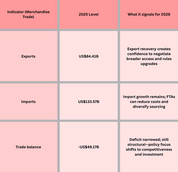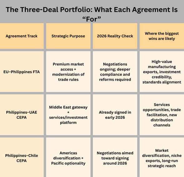 In 2026, the Philippines' trade agenda will go from "participation" to "positioning." The country is now pushing for a sharper market-access strategy based on three high-impact tracks: (1) a modern, rules-heavy free trade agreement with the European Union; (2) a newly signed Comprehensive Economic Partnership Agreement with the United Arab Emirates; and (3) an emerging CEPA-style deal with Chile that aims to open up Latin American pathways and strengthen Pacific trade connectivity.