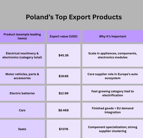 Poland’s manufacturing export strength comes from a wide set of industrial categories. Instead of depending on one “super export,” Poland ships many high-performing product lines into the EU—especially automotive-related goods, electronics, machinery and equipment, and manufactured consumer goods.