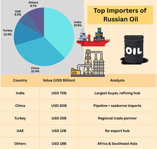 - India is the top importer, purchasing cheap Urals oil for processing and re-export.