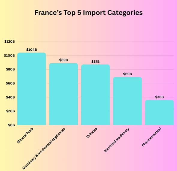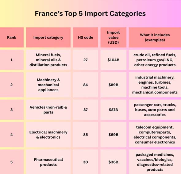 The most significant commodities that France will buy from other countries in 2025 show what a modern economy needs. Energy (HS 27) is the most essential item of the import bill, and it changes price quite easily. Machinery (HS 84) illustrates that a country can manufacture things and put money into them. HS 87 includes cars and parts, which show how people may get about and how European supply chains function together. Electronics (HS 85) assist factories get digital and become more electric. Pharmaceuticals (HS 30) make sure that healthcare keeps going.