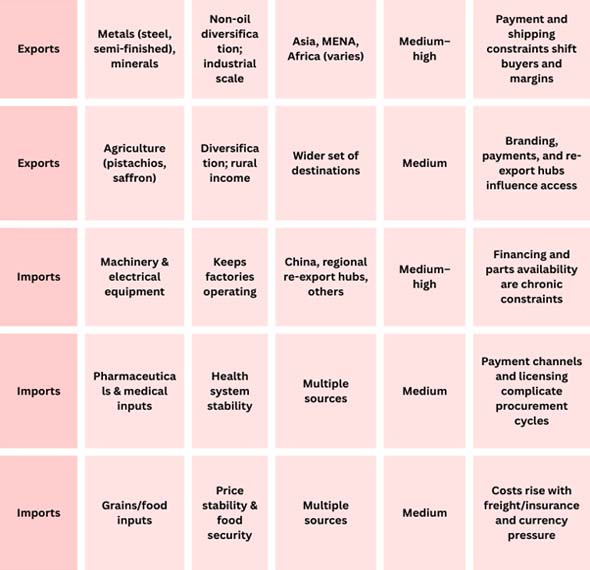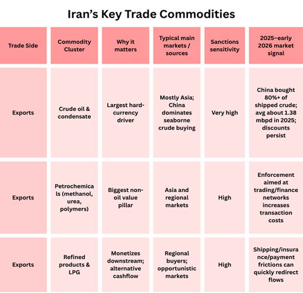 The easiest way to understand Iran's commerce with other countries in 2025–26 is to think of it as two economies moving in the same direction. One is the energy and commodities engine (crude, condensate, refined goods, petrochemicals, metals) that creates money and keeps industry going.