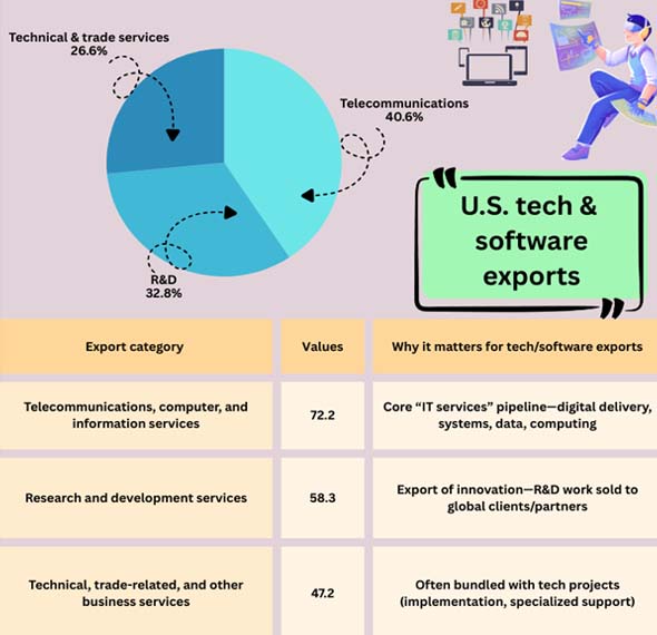 This change has made technology and software a key part of the U.S. export strength, especially through cross-border services like cloud computing, IT consulting, licensing intellectual property, and research-driven innovation.It's not just one type of technology that makes U.S. exports so strong; it's a whole ecosystem. A U.S. company might design semiconductors in the U.S., host services in global cloud regions, license IP to partners in other countries, and offer remote cybersecurity monitoring to clients throughout the world. These services are often all part of the same business partnership. This export engine is also strong.