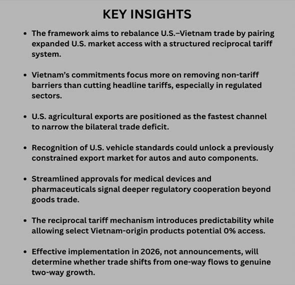With that in mind, the "Framework for an Agreement on Reciprocal, Fair, and Balanced Trade" between the U.S. and Vietnam (reached in late 2025) is best understood as a market-access-for-stability deal. Vietnam agrees to lower barriers and open up more opportunities for U.S. goods and services, while the U.S. keeps a clear reciprocal tariff structure and a way for some goods to move to a zero-rate category. This blog explains what's really new for exporters and importers, where access to markets is growing, and what 2026 will probably bring as the framework becomes more concrete.