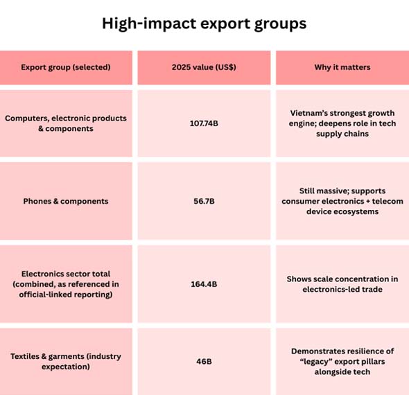Vietnam’s 2025 trade expansion was not a single-sector story. It was the combined effect of (1) electronics scaling, (2) supply-chain repositioning, (3) import intensity in advanced manufacturing, and (4) a steady broadening of export baskets.