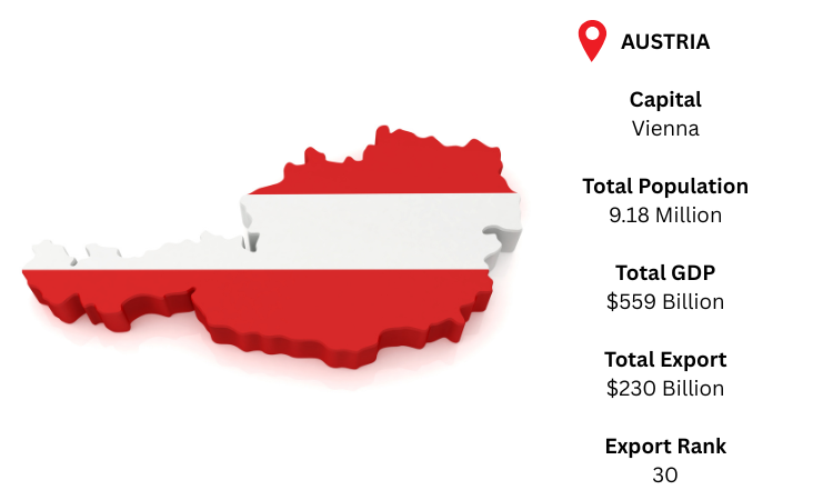 Austria, a landlocked nation in Central Europe, is renowned for its strong export-driven economy, sophisticated industry, and thriving services sector. Vienna, the capital, is a significant center for international trade, business, and diplomacy. As per Austria export data, about 9.18 million people call Austria home, and its GDP is projected to reach USD 559 billion. Austria is one of the top exporters in Europe, with total exports expected to reach USD 230 billion, according to export data. Germany continues to be Austria's top export market, taking in a variety of products such as automobiles, machinery, and medications. Austria's top export goods are still machinery and mechanical appliances.