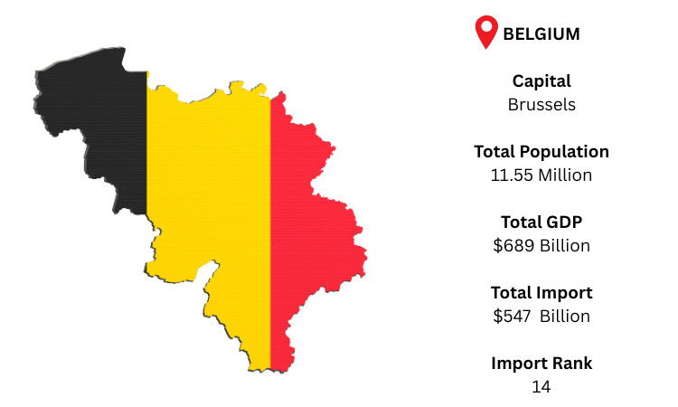Belgium, a Western European nation known for its open economy and top-notch logistics hubs, is ideally situated in the center of the EU. Brussels, the capital, is the administrative hub of Belgium and a significant EU headquarters. As per Belgium import data, about 11.55 million people live in Belgium, with a GDP of about USD 689 billion. With an anticipated total import of USD 547 billion, the nation ranks as the 14th largest importer globally. Belgium's largest import partner is the Netherlands, which provides substantial machinery, chemicals, and mineral fuels. Belgium's main imports are mineral fuels and oils, which are essential to the country's petrochemical, energy, and re-export sectors.