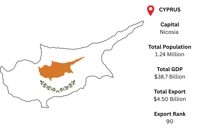 Cyprus is an island republic in the Mediterranean with a trade-based economy based on shipping, oil, and medicines. Nicosia is the capital and the administrative center of the nation. According to Cyprus export data, Cyprus, which has a population of around 1.24 million and a GDP of about USD 38.7 billion, had total exports of USD 4.50 billion in 2024, resulting in a trade imbalance of almost USD 8.93 billion.