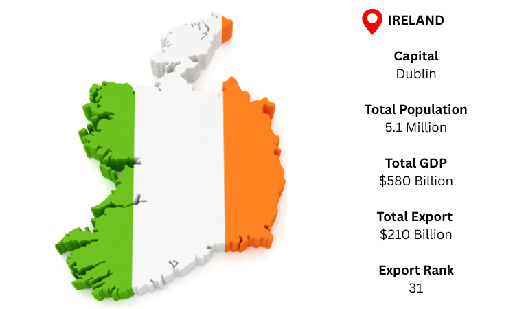 Ireland is a global leader in medicines, medical devices, and high-tech exports, and its economy is fueled by innovation. It serves as a vital link between North America and Europe thanks to its trade-driven economic strategy. The capital, Dublin, serves as Ireland's primary base for logistics and exports. As per Ireland export data, with a population of over 5.1 million and a GDP of almost USD 580 billion, Ireland is expected to rank among the top exporters in the EU per capita, with total exports of about USD 210 billion in 2024.
