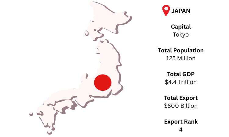 With sophisticated manufacturing enabling its exports of automobiles, equipment, and electronics, Japan, the third-largest economy in the world, is a major exporter. Millions of jobs are supported by Japanese exports, which also boost the country's standing as a global leader in industrial products and technology. The capital, Tokyo, is a major center for commerce. According to Japan export data, with a population of over 125 million and a GDP of almost USD 4.4 trillion, Japan is expected to export approximately USD 800 billion in total in 2024, highlighting its significant position as a high-tech exporter.