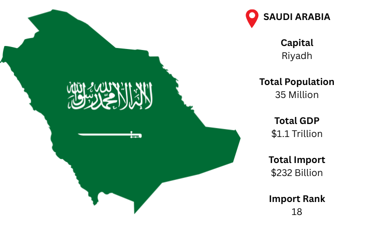 Under Vision 2030, Saudi Arabia, the largest economy in the Middle East, is quickly diversifying its economy, decreasing its reliance on oil while increasing its imports of automobiles, equipment, electronics, chemicals, and pharmaceuticals. The capital is Riyadh, and major ports like Jeddah and Dammam receive enormous volumes of goods. As per Saudi Arabia import data, Saudi Arabia, which has a population of over 35 million and a GDP of roughly USD 1.1 trillion, is expected to import USD 232 billion in total, demonstrating its growing industrial and consumer demand.