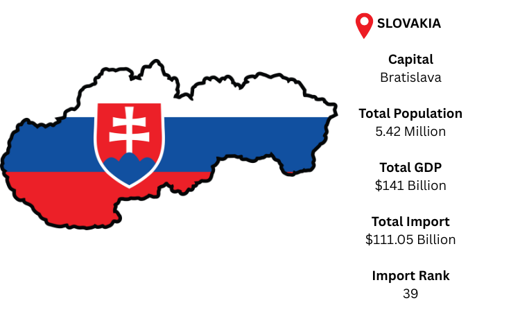Slovakia is a Central European country whose sophisticated automotive and electronics industries generate a sizable need for imports of machinery, automobiles, and electrical equipment. The capital is Bratislava, and ports like as Dunajská Streda and Bratislava facilitate commerce. As per Slovakia import data, Slovakia has a population of over 5.42 million and a GDP of about USD 141 billion. Its total imports came to USD 111.05 billion, demonstrating its importance in European supply chains.