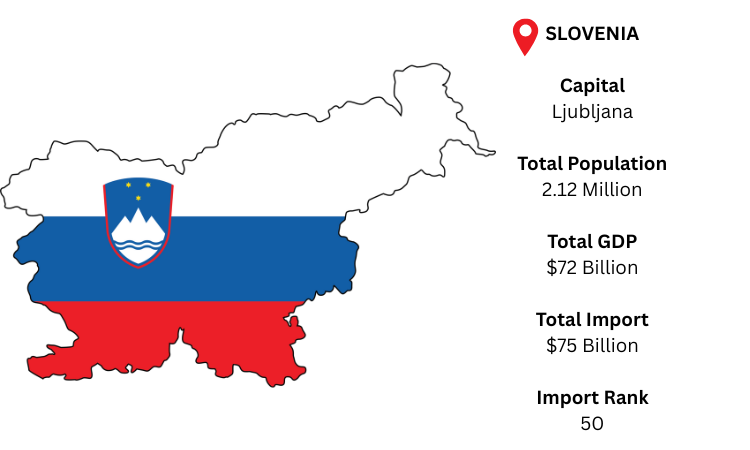 The advanced industrial, pharmaceutical, and automotive industries of Slovenia, a wealthy Central European nation, are mostly dependent on imports. Ljubljana's capital is mainly connected to international markets by road and rail through EU corridors. As per Slovenia import data, with a population of over 2.12 million and a GDP of about USD 72 billion, Slovenia is expected to import roughly USD 75 billion in total, showing a stable demand for electronics, cars, and chemicals.