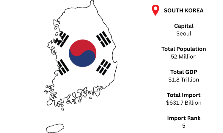 Seoul, South Korea's capital, is a global hub for the high-tech industry. South Korea is the 13th biggest economy in the world, with a population of around 52 million and a GDP of nearly USD 1.8 trillion. As per South Korea import data, the nation's industries are fueled by significant imports of raw materials, machinery, electronics, and energy. Its extensive involvement in global supply networks is demonstrated by the USD 631.7 billion in total imports.