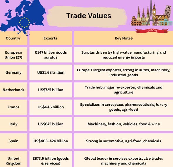 It went from having trade deficits to having a €147 billion goods trade surplus. The cost of bringing in energy decreased, and there were a lot of exports of machinery, chemicals, and high-tech goods. At the same time, Germany, the Netherlands, France, Italy, Spain, and the UK were still among of the world's major trading nations.