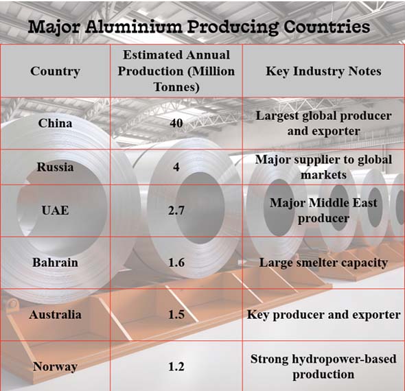 Ans. Bahrain, Qatar, and the UAE are some of the countries that have large aluminum smelters and make roughly 9% of the world's aluminum.