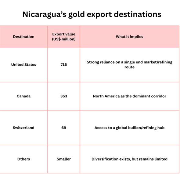Gold is a "safe haven," but its price goes up and down. As per Nicaragua Import Trade Statistics by Import Globals, if global rates, risk sentiment, or central bank buying patterns change, the value of exports can go down even if Nicaragua's mining volumes stay the same.