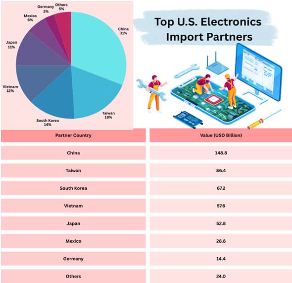 Ans. USA Export Import Global Trade Data indicates that China is the largest supplier, accounting for about 31% of U.S. electronics imports.