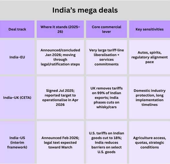 India's "mega deals" for 2025–26 all have the same goal: to lock in demand-side certainty (export access) while leaving leeway for policy changes in sensitive sectors (particularly agriculture and some industries) and leveraging trade frameworks to bring in investment and technology.