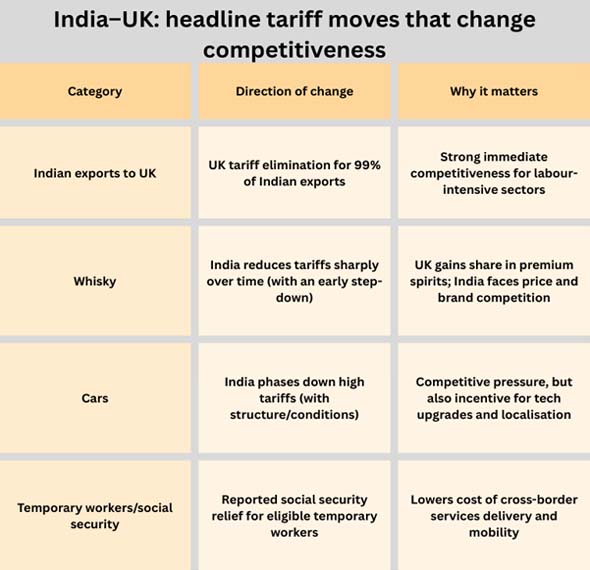 UK: a focused, business-driven deal that cuts tariffs on Indian exports by a lot and gives India time to make concessions on high-profile UK goods, such automobiles and whisky.