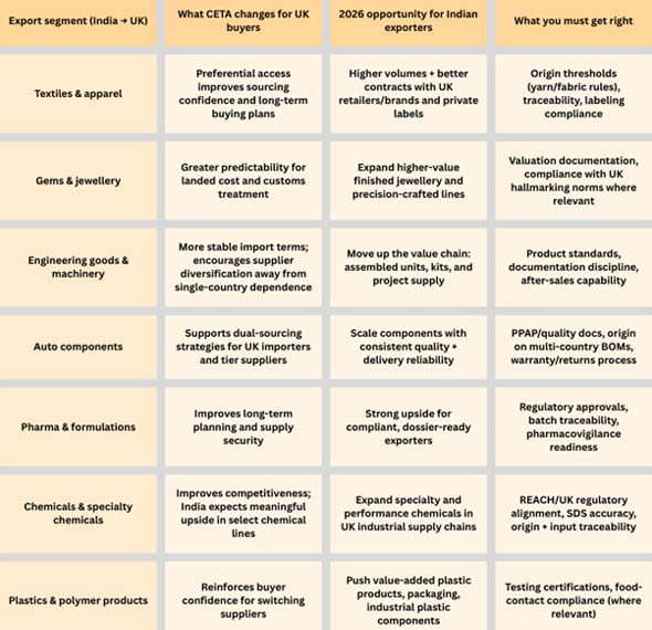 In 2025, the government talked to businesses about chemicals and said that CETA will lead to great export development in this area. They even gave predictions of how much various chemical sub-segments could increase and how much more they could export in FY 2025–26. The important thing to remember for 2026 is not the specific figure, but that UK customers will be actively looking for chemical suppliers that are ready for CETA. This means that compliance and origin preparedness will provide you a competitive edge.