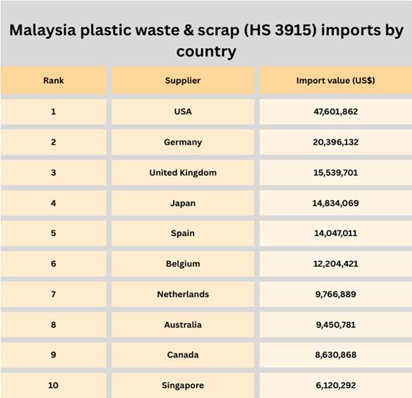 - As per Malaysia Exporter Data by Import Globals, after major import restrictions in China, global plastic waste trade shifted, and Southeast Asia became more prominent in supply chains (while also facing backlash and new controls).