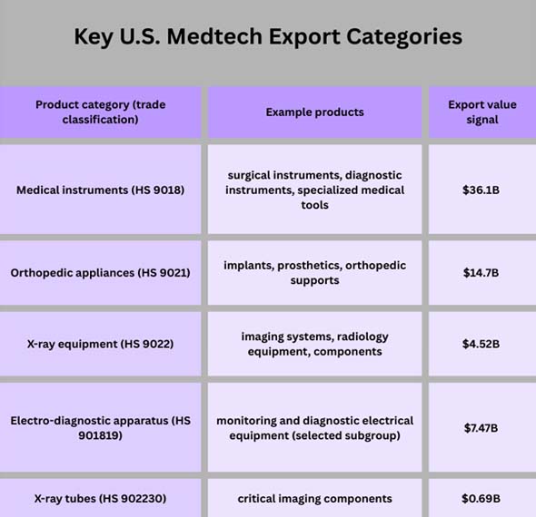 The U.S. does well in high-value, regulated areas including imaging, implants, and advanced diagnostics. Exports include both full systems and important parts (like tubes) that help the global manufacturing and maintenance ecosystems work.