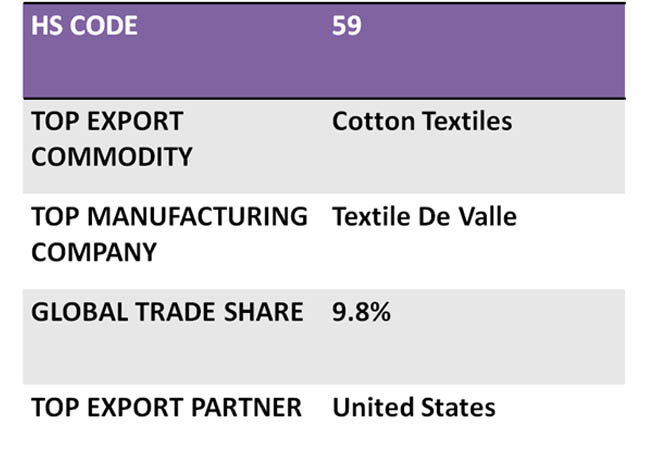 1. Textile De Valle - The Company being established in 1956 is one of the oldest and most renowned textile companies in the nation. Its specialty in producing high-quality cotton fabrics and garments for the international market and the ownership of state-of-the-art facilities equipped with modern machinery has promoted it as a top manufacturer. The annual trade revenue share of the company in 2024 is around 29%.