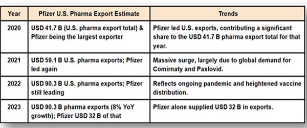 Furthermore, as per USA Export Import Global Trade Data by Import Globals, Pfizer's future export success will also depend on its innovation pipeline because patent cliffs for key blockbuster medications are imminent. It is rapidly growing its research in immunology, vaccines, and oncology, fields that are expected to account for the majority of its exports during the next ten years.