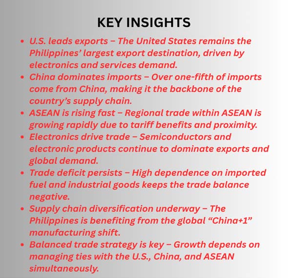 The U.S. is a stable and valuable export market, China is the backbone of the supply chain, and ASEAN offers chances for expansion in the region. These partnerships are the basis of the Philippines' worldwide trade strategy.
