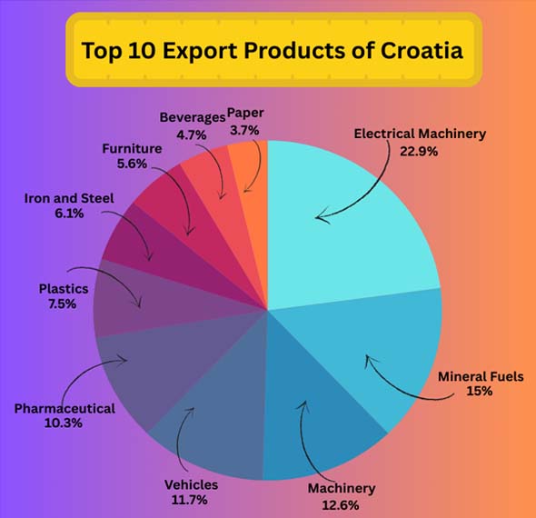 Ans. Croatia also sells metal or steel goods, medicines, plastics, iron and steel, furniture, drinks, and paper goods to other countries.