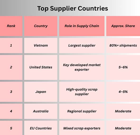 Ans. Vietnam is the primary supplier and exports the most products.