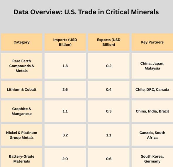 The USGS says that about 50 minerals are important for the economy and safety. By 2024, the government will have to buy all of them from other countries. As per USA Export Data by Import Globals, Manganese, graphite, niobium, and rare earth elements are some of them.