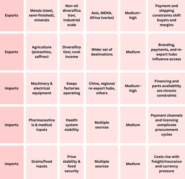 The easiest way to understand Iran's commerce with other countries in 2025–26 is to think of it as two economies moving in the same direction. One is the energy and commodities engine (crude, condensate, refined goods, petrochemicals, metals) that creates money and keeps industry going.