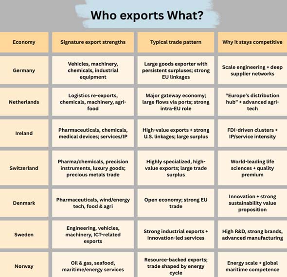 High-income European economies tend to "win" in global commerce by exporting high-value, high-compliance, and high-precision goods and services that are hard to copy fast.