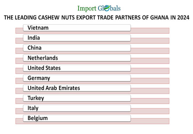 Ans. Vietnam leads the top export trade partner of Ghana for cashew nuts export in 2024.