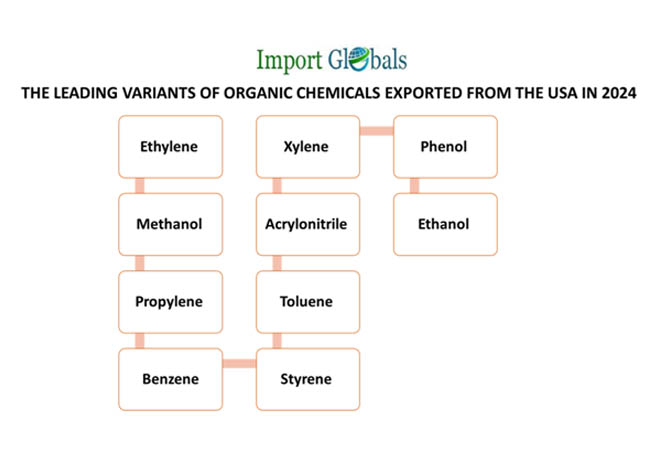 Ans. Ethylene is the top organic chemical exported from the USA in 2024.